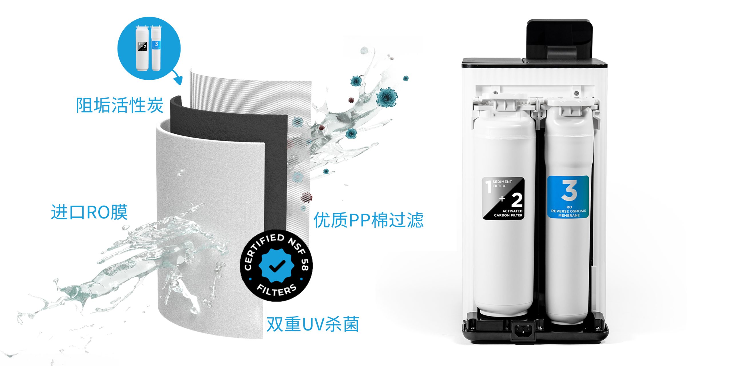 我们不仅采用先进的反渗透技术进行深度净化,更确保所有组件均为食品级材质,经过严苛测试,有效防止化学物或细菌污染。同时高效净滤,秒速生成可直饮矿物质水,无需储水箱,避免二次污染。